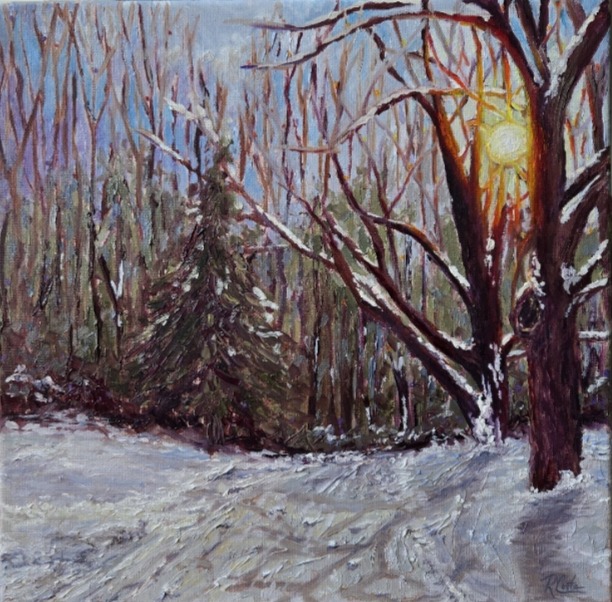 Description: Between The Trees, captures the quiet brilliance of a winters late afternoon. Impasto style technique, builds a tactile landscape where the low-hanging sun burns through the skeletal branches of a prominent foreground tree, casting warm, golden highlights against the deep mahoganies of the bark.